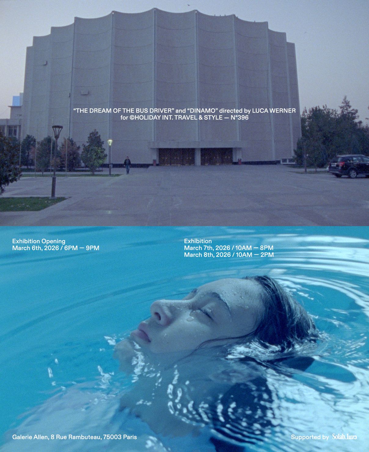 The exhibition, titled The Dream of the Bus Driver and Dinamo, took place at Galerie Allen (8 rue Rambuteau, 75003 Paris) on March 7 and 8, 2026, with a public opening on March 6 from 6 PM to 9 PM.